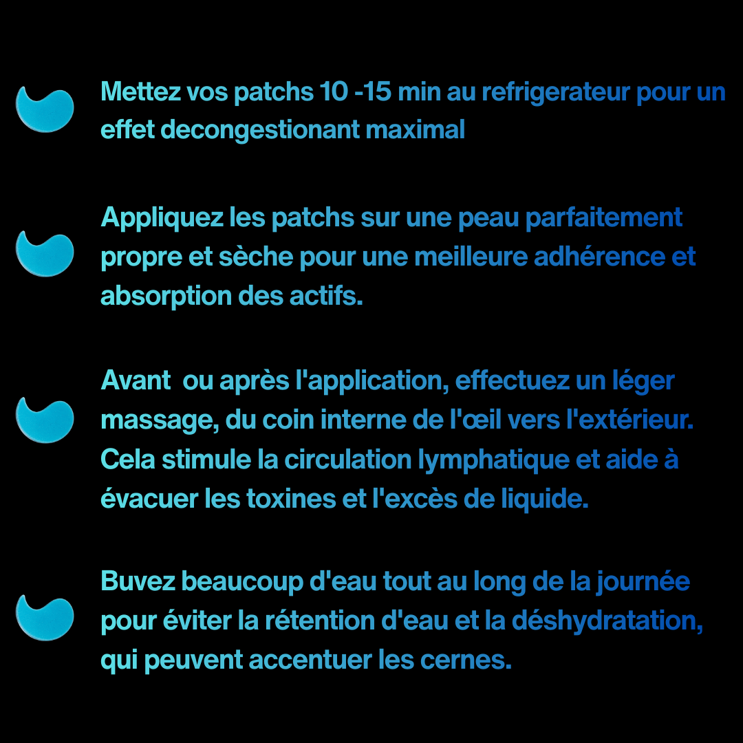 Les patchs contour des yeux hydratent, décongestionnent et lissent la zone sensible sous les yeux. Ils réduisent l’apparence des cernes, des poches et des ridules tout en apportant un effet frais immédiat.